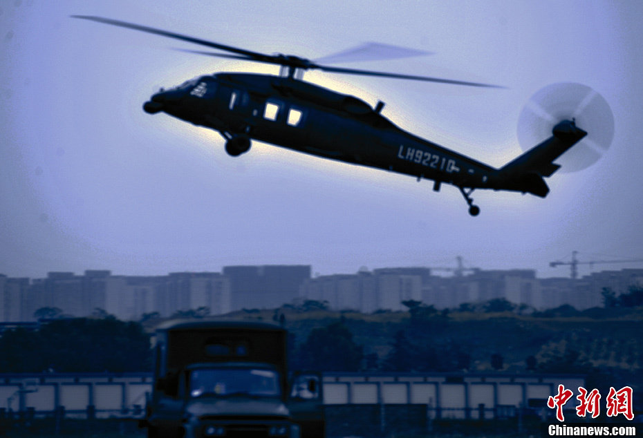 4月22日,成都軍區(qū)十三野戰(zhàn)軍陸航旅抗震救災(zāi)英雄團的直升機群,抓住四川雅安地震災(zāi)區(qū)日落前夕濃積雨霧天氣多變的一個多小時短暫時機,成功向偏辟鄉(xiāng)鎮(zhèn)搶運醫(yī)療隊伍和救災(zāi)物資。賈國榮 攝