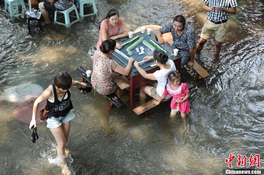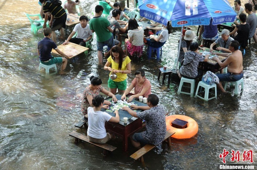 8月11日,重慶市民水中納涼。當(dāng)日,重慶市氣象臺(tái)發(fā)布“高溫紅色預(yù)警”信號(hào),渝中、大渡口、江北、沙坪壩、九龍坡、南岸、等地可達(dá)40℃。陳超/攝