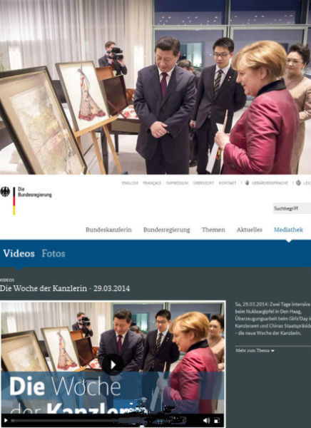 【互贈禮物】默克爾:“這是1735年德國繪制的第一幅精確的中國地圖!绷(xí)近平除了送給默克爾一套瓷器花瓶之外,彭麗媛還贈送了一套中國的民族音樂:“這張CD上共有六首中國民歌!(鳳凰衛(wèi)視)
