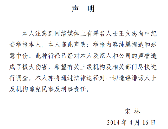 對(duì)此,宋林緊急發(fā)布個(gè)人聲明稱“本人注意到網(wǎng)絡(luò)媒體上有署名人士王文志向中紀(jì)委舉報(bào)本人。本人謹(jǐn)此聲明:舉報(bào)內(nèi)容純屬捏造和惡意中傷。此種行徑已經(jīng)對(duì)本人及家人和公司的聲譽(yù)造成了極大傷害,希望有關(guān)上級(jí)機(jī)構(gòu)及相關(guān)部門盡快進(jìn)行調(diào)查,本人亦將通過(guò)法律途徑對(duì)一切造謠誹謗人士及機(jī)構(gòu)追究民事及刑事責(zé)任!