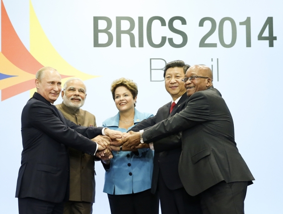 (7月15日,國家主席習(xí)近平在巴西福塔萊薩出席金磚國家領(lǐng)導(dǎo)人第六次會晤并發(fā)表重要講話。這是習(xí)近平同出席會晤的巴西總統(tǒng)羅塞夫、俄羅斯總統(tǒng)普京、印度總理莫迪、南非總統(tǒng)祖馬合影。攝影 蘭紅光)