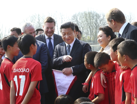 今年3月,習(xí)主席訪問歐洲,數(shù)次以足球話友誼:在荷蘭國王舉行的國宴上,習(xí)主席與荷蘭傳奇球星范德薩親切交談,贊揚(yáng)他是中國球迷的偶像;在中荷經(jīng)貿(mào)合作論壇上,習(xí)主席稱荷蘭足球隊(duì)為世界足球的“無冕之王”,博得滿堂彩;在巴黎舉行的中法建交50周年紀(jì)念大會上,習(xí)主席提到剛剛擔(dān)任中國男足主教練的法國人阿蘭·佩蘭,并祝他好運(yùn)。訪德期間,習(xí)近平和夫人彭麗媛專程看望了在德參加訓(xùn)練的陜西志丹少年足球隊(duì)隊(duì)員,并觀看他們比賽。