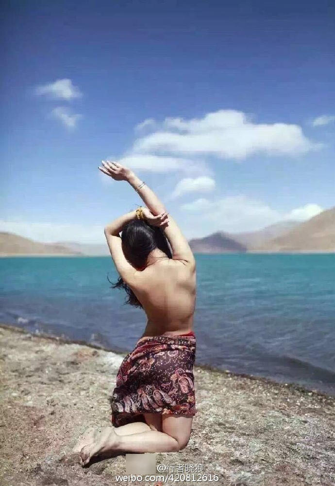 據(jù)微博用戶“YouchumDolkar”11日發(fā)布的一組圖片顯示,一位年輕女子在一個人煙稀少的湖邊拍照,其中有幾張衣著暴露,還有背面裸照。文字說明中稱“姑娘說大概是自己最好的時光來到西藏,所以想在這片圣土留有記憶”!癥ouchumDolkar”在微博中評論“好牛逼的攝影師加上一個好牛逼的模特。展現(xiàn)了什么是沒有文化與道德底線的思維”。