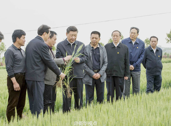 25日下午,習(xí)近平來到小崗村4300畝高標(biāo)準(zhǔn)農(nóng)田示范點(diǎn),沿著田埂走進(jìn)麥田,察看小麥長勢,向村干部、種糧大戶和農(nóng)技人員了解土地流轉(zhuǎn)、農(nóng)田整理、種植品種、畝產(chǎn)量、病蟲害防治、糧食收購等情況。聽了大家介紹情況,總書記說,現(xiàn)在正值抽穗灌漿的關(guān)鍵時(shí)期,要加強(qiáng)田間管理,實(shí)現(xiàn)豐收,今年的白饃能吃到嘴里了。
