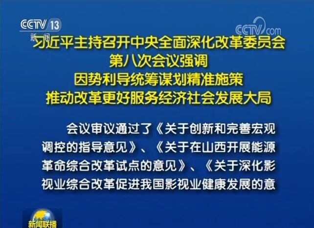 會議審議通過了《關于創(chuàng)新和完善宏觀調控的指導意見》、《關于在山西開展能源革命綜合改革試點的意見》、《關于深化影視業(yè)綜合改革促進我國影視業(yè)健康發(fā)展的意見》、《關于加強創(chuàng)新能力開放合作的若干意見》、《關于治理高值醫(yī)用耗材的改革方案》、《關于改革完善體制機制加強糧食儲備安全管理的若干意見》、《關于完善建設用地使用權轉讓、出租、抵押二級市場的指導意見》、《關于加快農業(yè)保險高質量發(fā)展的指導意見》、《關于進一步推進移風易俗建設文明鄉(xiāng)風的指導意見》和《關于各地區(qū)各部門貫徹落實中央全面深化改革委員會會議精神深入推進改革督察工作的報告》。
