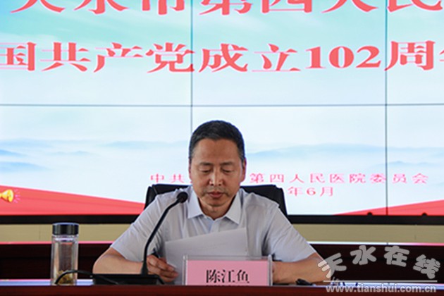 大會在莊嚴(yán)的國歌聲中拉開序幕,紀(jì)委書記謝紅娟同志宣讀了院黨委《關(guān)于表彰先進(jìn)黨支部、優(yōu)秀共產(chǎn)黨員和優(yōu)秀黨務(wù)工作者的決定》;院領(lǐng)導(dǎo)分別為榮獲“先進(jìn)黨支部”、“優(yōu)秀共產(chǎn)黨員”和“優(yōu)秀黨務(wù)工作者”的先進(jìn)集體和優(yōu)秀個(gè)人頒發(fā)了榮譽(yù)證書,并為廣大黨員頒發(fā)“政治生日”賀卡;先進(jìn)黨支部代表姚小虎同志和優(yōu)秀黨務(wù)工作者劉春艷同志作了表態(tài)發(fā)言;原天水鐵路醫(yī)院院長、老一輩專家代表甄天治同志為廣大黨員講述了發(fā)人深省的黨課;黨委書記陳江魚同志作了大會講話,就如何進(jìn)一步加強(qiáng)公立醫(yī)院黨的建設(shè),引領(lǐng)醫(yī)院高質(zhì)量發(fā)展提出了新的要求。