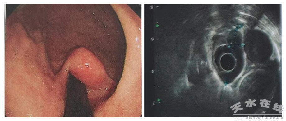 今年52歲的劉女士,因腹部不適就診首都醫(yī)科大學(xué)北京同仁醫(yī)院,行胃鏡檢查,發(fā)現(xiàn)賁門翻轉(zhuǎn)位可見似黏膜下腫樣隆起,約2.0*1.5cm;超聲內(nèi)鏡提示病變位于胃壁第四層,偏低回聲,測量大小約3.5*1.0cm。