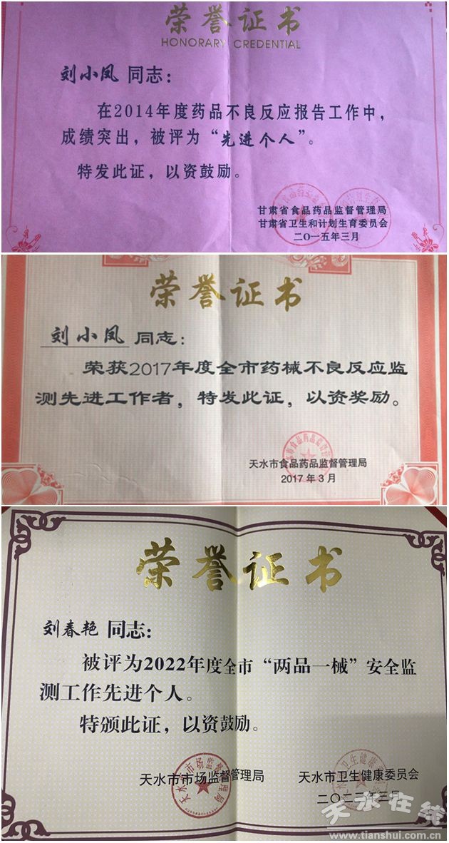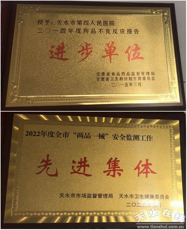 自我省開展藥品不良反應(yīng)監(jiān)測工作以來,醫(yī)院高度重視,持續(xù)健全制度體系、提升信息化建設(shè),創(chuàng)新工作方式,在全院上下的共同努力下,我院藥品不良反應(yīng)監(jiān)測工作得到了上級部門的充分肯定。先后被原甘肅省食品藥品監(jiān)督管理局、原甘肅省衛(wèi)生和計劃生育委員會評為“藥品不良反應(yīng)報告進步單位”、被天水市市場監(jiān)督管理局、天水市衛(wèi)生健康委員會評為全市“兩品一械”安全監(jiān)測工作先進集體,同時獲得個人榮譽5項。