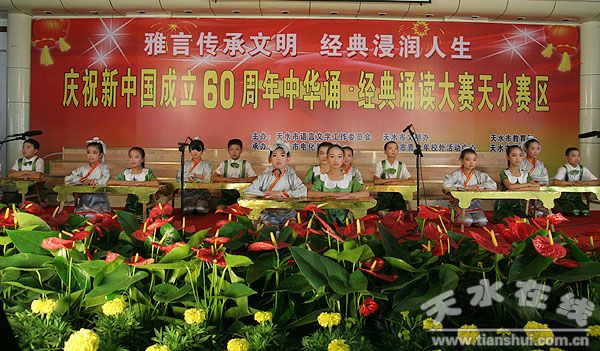為慶祝新中國成立60周年,營造文明和諧的慶典氛圍,弘揚中華優(yōu)秀傳統(tǒng)文化,在第12個全國推普周期間,中華誦·2009經(jīng)典誦讀大賽天水賽區(qū)總決賽于9月19日在青少年活動中心拉開帷幕。