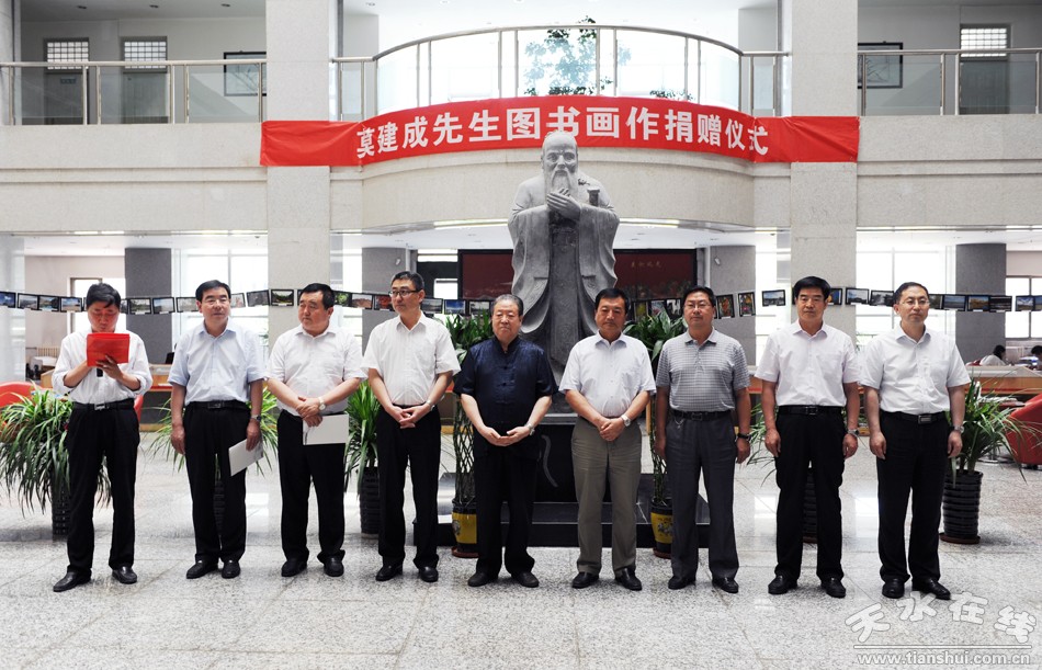 6月12日下午,莫建成先生圖書及畫冊捐贈儀式在天水師范學(xué)院逸夫圖書館二樓大廳舉行。莫建成先生,省高校工委書記、省教育廳副廳長、政協(xié)甘肅省委員會科教文衛(wèi)體委員會副主任王智平,省文聯(lián)副主席王登渤,省委宣傳部文藝處處長封奎海,省內(nèi)相關(guān)媒體記者、學(xué)校全體在家領(lǐng)導(dǎo)出席捐贈儀式,儀式由副校長安濤主持。