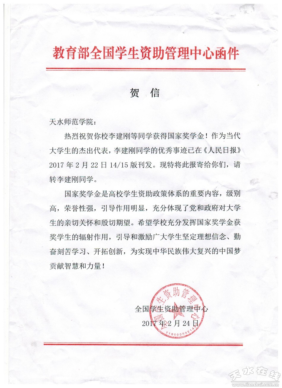 日前,人民日?qǐng)?bào)整版刊登了國家獎(jiǎng)學(xué)金獲獎(jiǎng)學(xué)生代表名錄,天水師范學(xué)院資源與環(huán)境工程學(xué)院2012級(jí)地理科學(xué)專業(yè)李建剛同學(xué)名列其中。該名錄經(jīng)全國各高校推薦、專家評(píng)選,從5萬名國家獎(jiǎng)學(xué)金獲得者中擇優(yōu)選出108人。全省高校僅蘭州大學(xué)和天水師范學(xué)院學(xué)生獲此殊榮。