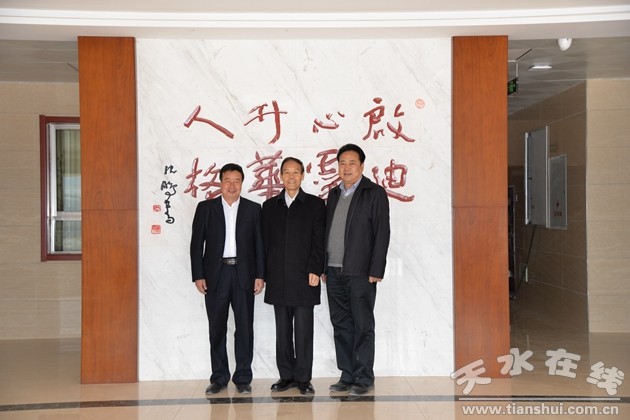 (學(xué)校董事長(zhǎng)羊正寧、校長(zhǎng)趙五成與魏書(shū)生先生合影)