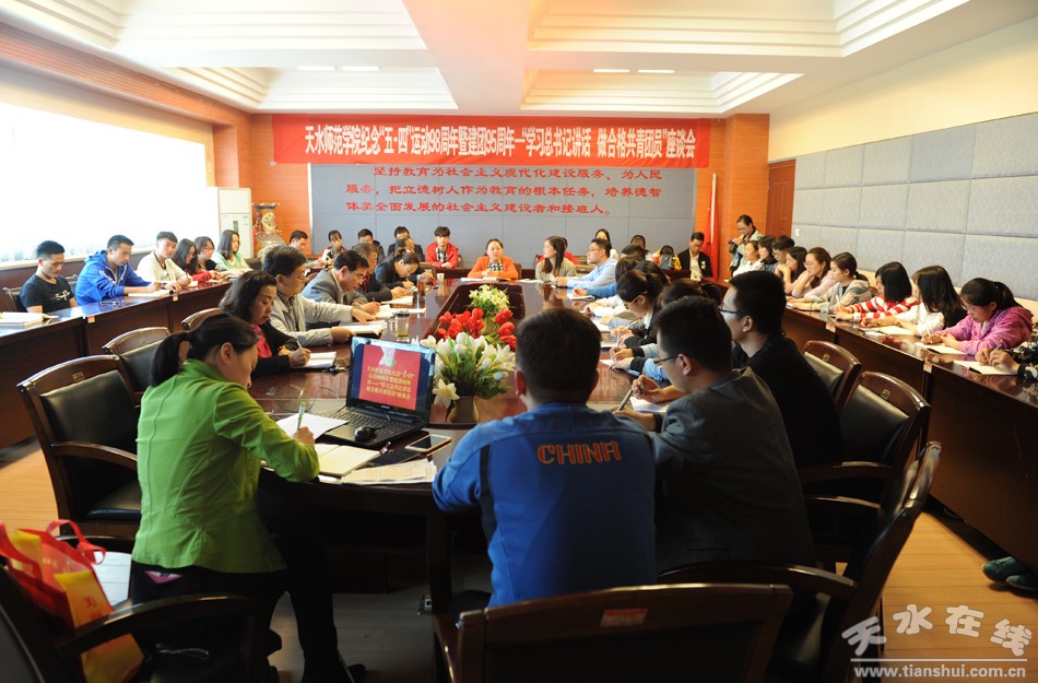 5月4日下午,天水師范學(xué)院在行政樓412會(huì)議室召開紀(jì)念五四運(yùn)動(dòng)98周年暨建團(tuán)95周年——“學(xué)習(xí)總書記講話 做合格共青團(tuán)員”座談會(huì)。 黨委副書記師平安,黨委常委、組織部部長(zhǎng)馬超,黨委常委、宣傳部部長(zhǎng)汪詠國(guó),機(jī)關(guān)黨工委書記許晶敏,團(tuán)委書記曹晶瑜,學(xué)生工作處助學(xué)管理中心主任劉正,團(tuán)委副書記劉穎及各二級(jí)學(xué)院分團(tuán)委書記和30余名團(tuán)員代表參加座談會(huì)。
