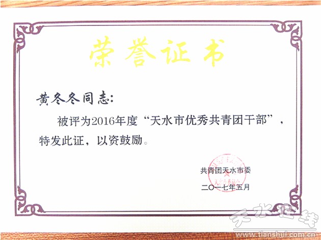 今年“五四”期間,共青團(tuán)天水市委評(píng)選表彰了一批優(yōu)秀支部和個(gè)人。天水一中團(tuán)委,市一中教師黃冬冬和高三級(jí)學(xué)生太雯分別獲得2016年度天水市“五四紅旗團(tuán)委”、“優(yōu)秀團(tuán)干部”、“優(yōu)秀團(tuán)員”榮譽(yù)。