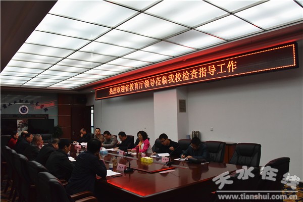 10月13日,甘肅省教育廳督導(dǎo)組組長(zhǎng)、基礎(chǔ)教育二處處長(zhǎng)蘇鋒,省教育廳思想政治處處長(zhǎng)牛輝峰、省教育廳基礎(chǔ)教育二處副處長(zhǎng)倪清貴、省教育廳基礎(chǔ)教育二處干部楊嘉磊、趙昕宇,原甘肅省商業(yè)學(xué)校校長(zhǎng)王慶華、省課程教材中心副主任高定量一行到甘肅工業(yè)職業(yè)技術(shù)學(xué)院檢查指導(dǎo)工作。該校黨委書記王志年代表學(xué)校作工作匯報(bào),副校長(zhǎng)李玉生,學(xué)校組織部、宣傳部、校辦公室、財(cái)務(wù)處、保衛(wèi)處等部門負(fù)責(zé)人參加。