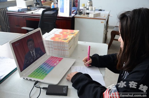 學院在家領導李宗義、趙彥軍、堅葆林、張德龍、毛文輝、霍五堂及廣大師生在五號樓多功能廳認真收聽收看習近平同志代表第十八屆中央委員會向大會作的題為《決勝全面建成小康社會 奪取新時代中國特色社會主義偉大勝利》的報告。學生在校園、教室、宿舍通過廣播、互聯(lián)網等多種方式收聽收看十九大開幕式直播。收聽收看過程中,大家不時在筆記本上認真做記錄。