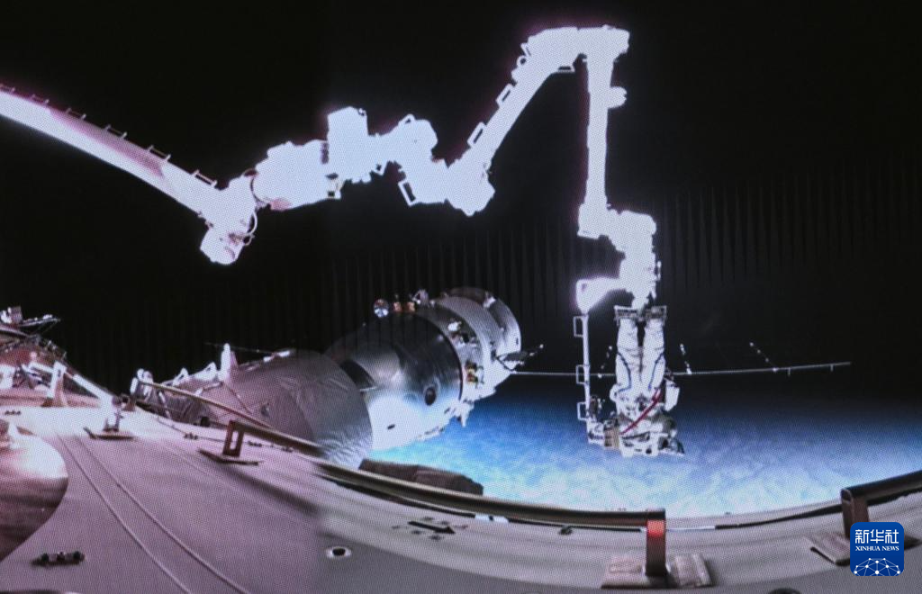 3月2日,在北京航天飛行控制中心拍攝的神舟十七號(hào)航天員江新林在空間站機(jī)械臂的輔助下進(jìn)行艙外作業(yè)。新華社記者 李賀 攝