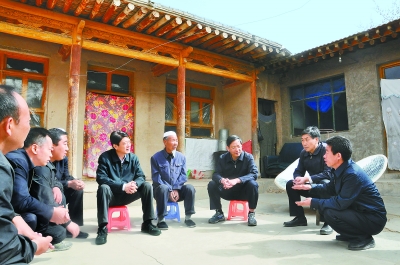 4月18日上午,省委副書記、省長劉偉平在臨夏回族自治州永靖縣三灣村調(diào)研扶貧開發(fā)工作,與貧困群眾和當(dāng)?shù)馗刹抗采堂撠氈赂淮笥嫛?nbsp;本報記者 白德斌