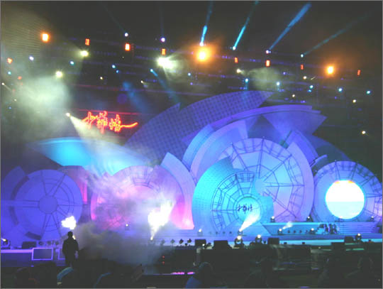 同時,在舞臺上搭建的黃河水車布景上安裝了近2000個不同顏色的燈泡,而且還有12臺液晶電視安裝在舞臺上。為了在拍攝時不反光,還給象征黃河的水池中鋪設(shè)了400平方米的黑布。