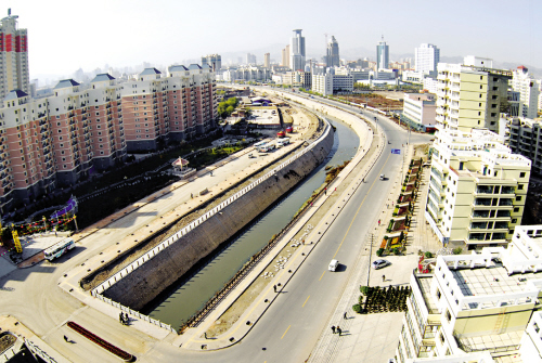 河道北岸新建的公路寬闊通暢,岸壩、護(hù)堤、護(hù)欄、到公路、人行道、休閑區(qū)的修建到整體工程的綠化也已經(jīng)開始。目前在河道北岸坡面進(jìn)行了臨時綠化,種植了適合地理環(huán)境和土壤環(huán)境的草坪,一段河道的護(hù)欄已經(jīng)安裝起來了。河道南岸的堤壩上機器轟鳴,一片熱火朝天的繁忙景象;不久后,養(yǎng)育我們的母親河又將形成南北兩河的格局。”