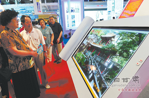 亮相蘭洽會的平?jīng)鍪酗L(fēng)光介紹片吸引市民駐足觀看。本報記者 李小龍 攝