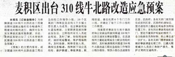 本報訊【記者 趙曉玲】為保障國道310線牛北段改造工程建設(shè)期間道路運(yùn)輸?shù)陌踩珪惩ê凸こ探ㄔO(shè)的順利進(jìn)行,確保對各類突發(fā)事故實(shí)施有效救援,日前,麥積區(qū)制定出臺了《天水市麥積區(qū)國道3 10線牛北段改造工程應(yīng)急預(yù)案》。