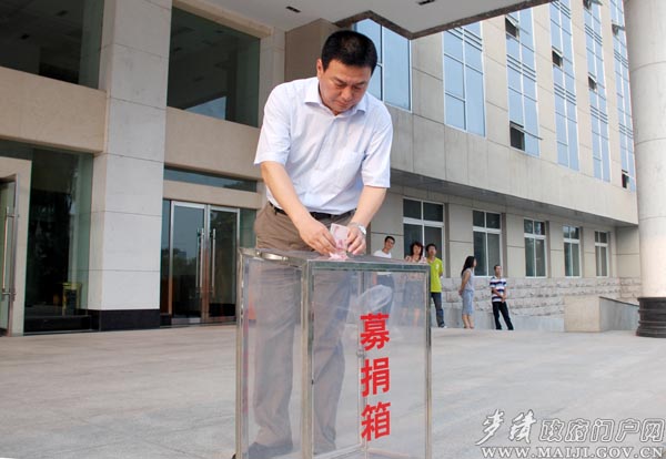 10日下午,麥積區(qū)四大組織機關(guān)干部職工向舟曲災(zāi)區(qū)捐款活動在區(qū)政府大院舉行。區(qū)領(lǐng)導(dǎo)蒲軍、胡福林、張克強、賈應(yīng)珍等帶頭捐款、奉獻愛心,廣大干部職工紛紛響應(yīng)、慷慨解囊。據(jù)統(tǒng)計,短短十幾分鐘,捐助現(xiàn)場就收到捐款35500元。