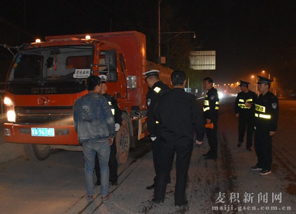 為切實(shí)加強(qiáng)“冬防”期間大氣污染防治管控,麥積區(qū)交警大隊(duì)聯(lián)合區(qū)城管、運(yùn)管、環(huán)保等部門進(jìn)一步強(qiáng)化渣土車輛監(jiān)管,加大執(zhí)法力度,采取日間巡查和夜間定點(diǎn)檢查相結(jié)合的方式,對(duì)未遮蓋及遮蓋不嚴(yán)、帶泥上路、不按 “四限”要求(限時(shí)段、限路段、限速、限高)的渣土車及煤炭、沙料等運(yùn)輸車輛進(jìn)行嚴(yán)管重罰,及時(shí)停擋違規(guī)運(yùn)輸車輛,對(duì)嚴(yán)重違反限時(shí)段、限路段、限速、限高“四限”要求的車輛依法予以了查扣。