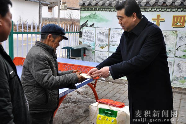 雞年春節(jié)即將來(lái)臨,1月20日,麥積區(qū)委常委、宣傳部長(zhǎng)楊根林帶領(lǐng)區(qū)委宣傳部干部職工深入雙聯(lián)點(diǎn)麥積鎮(zhèn)灘子村走訪慰問(wèn)聯(lián)系戶和困難戶,詳細(xì)了解他們的生活生產(chǎn)情況,為他們送去了慰問(wèn)金及棉被、米、油、對(duì)聯(lián)等慰問(wèn)品,并祝愿他們度過(guò)一個(gè)愉快、祥和的新春佳節(jié)。