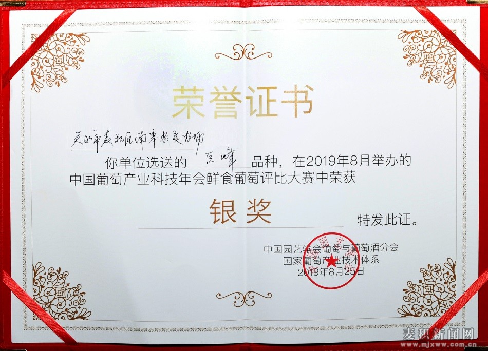 麥積區(qū)融媒體中心訊(特約記者 竇耀輝)8月30日,記者從天水市麥積區(qū)果業(yè)發(fā)展中心獲悉,由該中心推薦麥積區(qū)南皋家庭農(nóng)場、麥積區(qū)綠旺葡萄專業(yè)合作社兩企業(yè)選送的“巨峰”葡萄,在今年8月份參加中國園藝學(xué)會葡萄與葡萄酒分會、國家葡萄產(chǎn)業(yè)技術(shù)體系共同舉辦的中國葡萄產(chǎn)業(yè)科技年會鮮食葡萄評比大賽中分別榮獲銀獎。