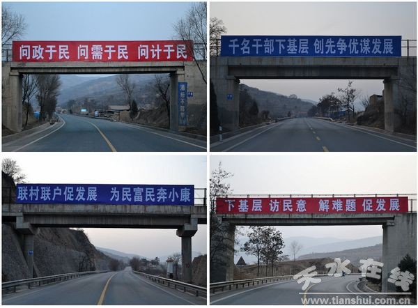 為了貫徹會(huì)議精神,秦安縣在310國道秦安段過街天橋,靖天路、葉蓮路、魏寺路、秦甘路、秦遠(yuǎn)路等路段和鄉(xiāng)鎮(zhèn)人口密集地懸掛永久性大幅宣傳標(biāo)語80多條。同時(shí)充分運(yùn)用秦安新聞網(wǎng)、秦安政府網(wǎng)、秦安電視臺、秦安廣播電臺等媒體,多層面、多角度廣泛深入宣傳。通過正面的宣傳引導(dǎo)使各級各單位和廣大干部群眾對“聯(lián)村聯(lián)戶、為民富民”行動(dòng)的指導(dǎo)思想、基本原則、目標(biāo)要求等到充分的認(rèn)識,使各級各單位和廣大干部工作的實(shí)踐得到及時(shí)反映,為全縣“聯(lián)村聯(lián)戶、為民富民”行動(dòng)開展?fàn)I造了良好的輿論氛圍。