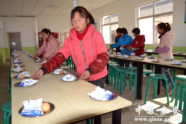當(dāng)我們來到大莊小學(xué)時,正好碰上中午學(xué)生們吃早餐的時間,走進(jìn)食堂,看到食堂寬敞明亮,桌椅整齊潔凈,學(xué)生組長和老師們正在往桌子上擺放早餐奶和雞蛋。筆者問一位正在用餐的學(xué)生:“學(xué)校食堂怎么樣?”“非常棒!自從去年省上的叔叔阿姨們來了后,為我們建起了這座漂亮的大房子后,我們現(xiàn)在吃營養(yǎng)餐舒服多了。”六年級高亞杰回答道。