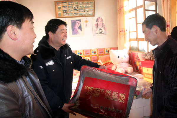 12月18日早8時,天水市公安局副局長、交警支隊支隊長霍秦生帶領(lǐng)支隊“雙聯(lián)”行動第一行動組部分民警,帶著新購買的軍用棉被來到他們的聯(lián)系幫扶點——秦安縣蓮花鎮(zhèn)好地村,在凜凜寒冬之際向當(dāng)?shù)靥乩舸迕袼腿チ颂焖痪瘻嘏年P(guān)懷。