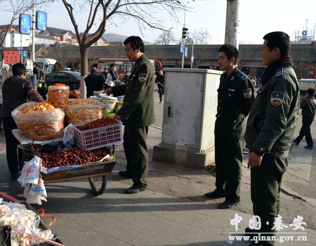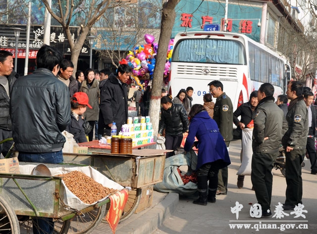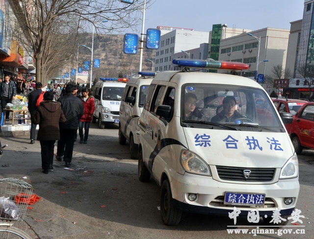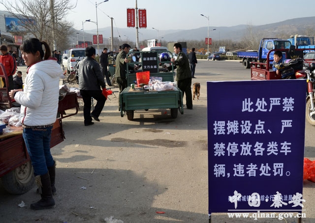 2013年春節(jié)即將來臨,為確保市容整潔、交通順暢,秦安縣采用疏堵并舉的策略,一方面在城區(qū)次主干道旁設(shè)置節(jié)日商品臨時市場,安置節(jié)日期間各類攤點(diǎn),另一方面,加大執(zhí)法力度,嚴(yán)禁各類攤點(diǎn)占用機(jī)動車道擺放,避免交通擁堵的發(fā)生,一疏一堵,占道經(jīng)營影響市容秩序的問題得到有效解決,城區(qū)市容秩序由往年的“無序”變得“有序”。