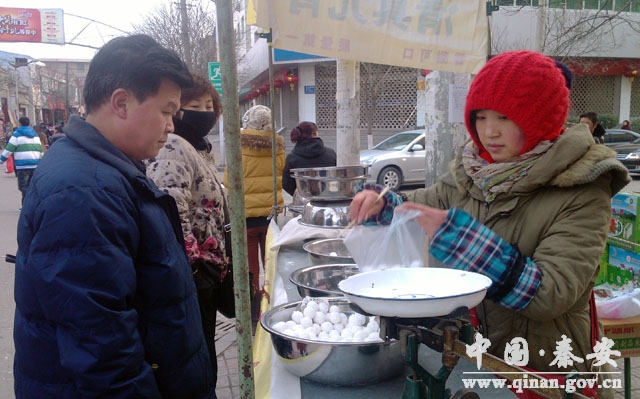 在秦安縣青年路,記者看到手工湯圓也格外受歡迎,銷售攤位前絡繹不絕!跋啾人賰鰷珗A來說,手工湯圓的很實惠,而且還可以同時買好幾種不同口味的湯圓!闭谶x購湯圓的市民孫女士對記者說。