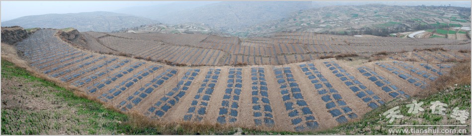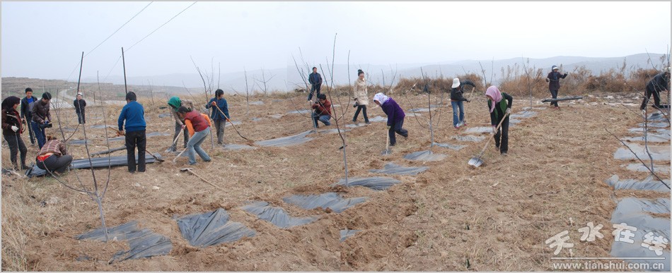 4月21日,在秦安縣興豐鄉(xiāng)高咀梁優(yōu)質(zhì)蘋果標(biāo)準(zhǔn)示范園,正在覆膜的張莊村村民魏永紅高興地告訴記者:“現(xiàn)在我們?cè)诤玫乩锓N果樹,在荒地種綠化樹,不僅改善了環(huán)境,也進(jìn)一步減少了水土流失!