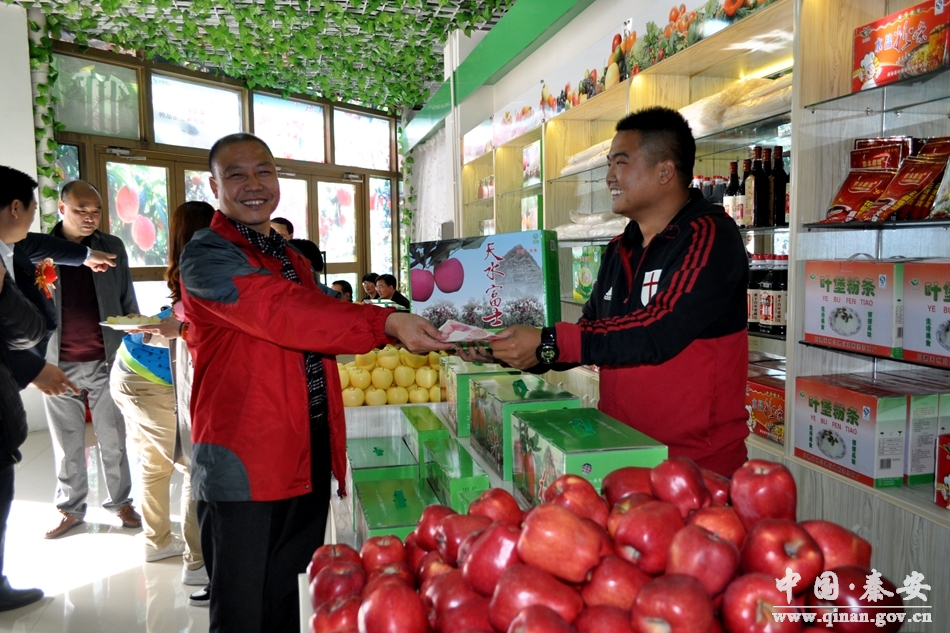 走進(jìn)秦安特色產(chǎn)品直銷(xiāo)店,店面不大,里面卻匯聚了20多種秦安當(dāng)?shù)氐奶禺a(chǎn),有秦安花椒、葉堡粉條、隴城香醋等綠色農(nóng)產(chǎn)品。在擺放新鮮蘋(píng)果的柜臺(tái)上,聚集了好多當(dāng)?shù)厝,表示出?duì)秦安蘋(píng)果的極大熱情!斑@是我們秦安生產(chǎn)的紅富士蘋(píng)果,營(yíng)養(yǎng)豐富,香脆多汁,鮮嫩可口,是連夜運(yùn)輸過(guò)來(lái)的,您可以先嘗一個(gè)!笔圬泦T熱情地作著介紹。