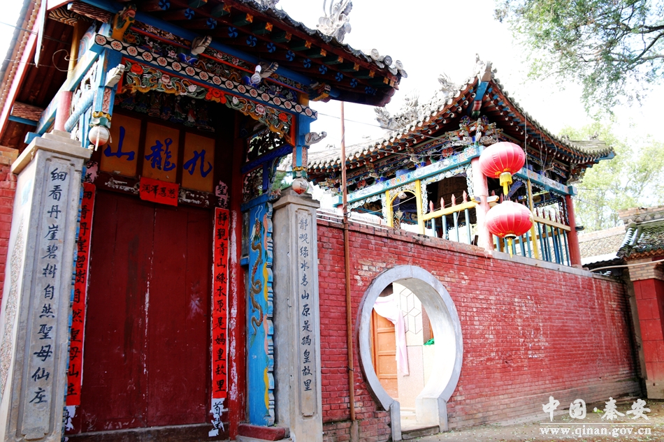 九龍山在簸箕灣梁突兀渾起,又陡然跌落,山下有棲鳳臺,建有九龍廟。廟始建于元大德八年(1304年),祠九龍山圣母。據(jù)現(xiàn)存于九龍廟的元代碑文記載:“九龍層巒疊嶂,巨壑幽谷,啟肇原隴……草木貢四時之秀,煙霞共千山之奇,真仙靈之窟宅!北挠涊d地震之后,在九龍廟附近,涌出一眼清泉,為九龍山圣母之湫泉,稱九龍湫。“九龍湫窟”也為《秦安志》所稱“八觀”之一,清乾隆二十七年曾在湫上建起“八卦玄井亭”。清代牛運震、董秉純、諸為霖等秦安知縣和孫海等地方士紳鄉(xiāng)賢每至天旱之年常去此地取湫求雨,留下許多文字和碑刻。附近另有五女峰,喇嘛墳,邊家河脫骨寺等圣母圣跡。