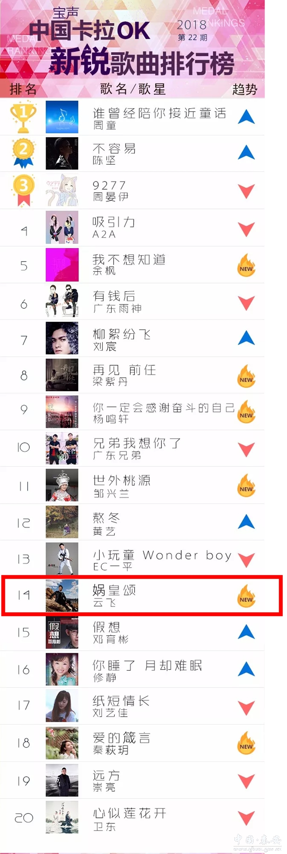 2018年6月21日,秦安縣隴城鎮(zhèn)萬(wàn)民空巷,莊嚴(yán)肅穆的女?huà)z祭祀典禮現(xiàn)場(chǎng),驚艷秦隴大地的《媧皇頌》再次響起,懷著無(wú)比虔誠(chéng)之心的媧皇兒女在情深意長(zhǎng)、蒼勁靈動(dòng)、綿延悠揚(yáng)的贊歌聲中追遠(yuǎn)懷古,共同感悟著人類(lèi)始祖女?huà)z摶土造人、煉石補(bǔ)天、肇啟文明的豐功偉績(jī)。就在當(dāng)天,《媧皇頌》正式在中國(guó)卡拉OK入庫(kù)上線,在2018年第22期“中國(guó)卡拉OK新銳歌曲排行榜中”位居第14位,這是全市唯一一首進(jìn)入中國(guó)卡拉OK樂(lè)庫(kù)宣傳推介秦安的經(jīng)典歌曲。