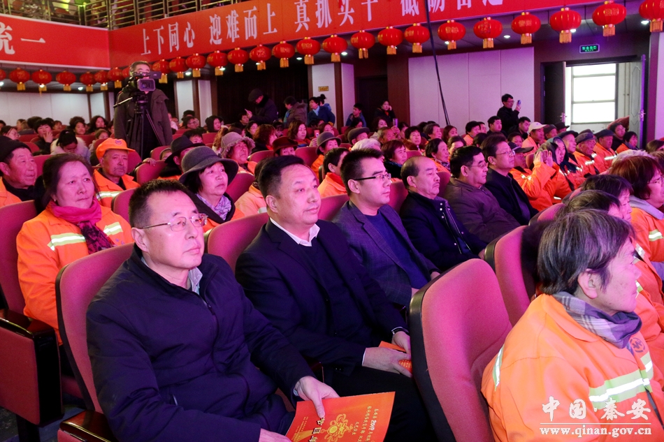 徐東明在致辭中首先代表縣委、縣人大、縣政府、縣政協(xié)向奮戰(zhàn)在一線的廣大精準(zhǔn)扶貧工作隊員、鄉(xiāng)鎮(zhèn)干部、環(huán)衛(wèi)職工致以親切的慰問,向關(guān)心支持全縣各項事業(yè)發(fā)展的駐秦單位、廣大干部職工和社會各界人士表示真誠的感謝。他說,剛剛過去的一年,縣委、縣政府團(tuán)結(jié)帶領(lǐng)全縣廣大干部群眾,苦干實干,不懈奮斗,城鄉(xiāng)面貌發(fā)生明顯改變,脫貧攻堅取得顯著成效,全縣經(jīng)濟(jì)發(fā)展和社會建設(shè)取得可喜成績。這些成績的取得離不開廣大一線工作者的不懈努力,特別是廣大環(huán)衛(wèi)工作者的無私奉獻(xiàn)和任勞任怨,以及廣大的駐村幫扶工作隊員、鄉(xiāng)鎮(zhèn)干部的凝心聚力與攻堅克難。希望全縣廣大干部職工能夠繼續(xù)保持昂揚(yáng)的精神狀態(tài),繼續(xù)發(fā)揚(yáng)優(yōu)良作風(fēng),開拓創(chuàng)新、銳意進(jìn)取,在各自的工作崗位上再立新功、再創(chuàng)輝煌,為如期全縣整體脫貧摘帽、全面建成小康社會作出新的更大的貢獻(xiàn),以優(yōu)異的成績向新中國70華誕獻(xiàn)禮。