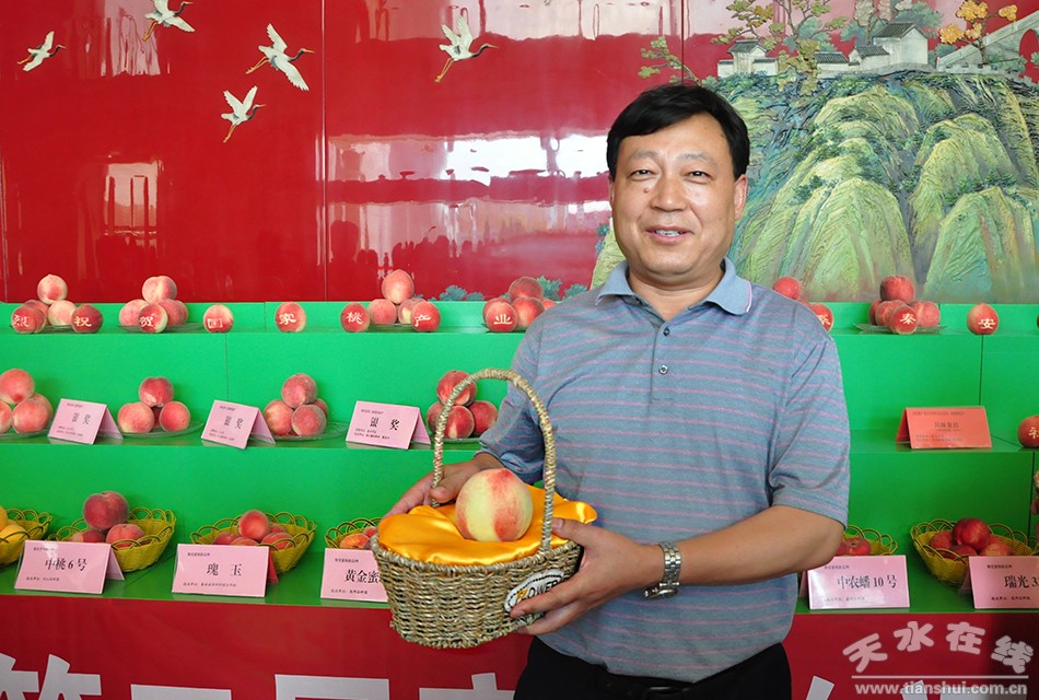 天水在線2016年8月8日秦安報道 今天下午,國家桃產(chǎn)業(yè)技術(shù)體系秦安縣第二屆蜜桃鑒評會舉行頒獎大會。會上,天水市政府副市長霍衛(wèi)平,秦安縣委副書記、縣長程江芬分別為拍得“桃王”的景園集團(tuán)和拍得“桃后”的天麟集團(tuán)授桃。