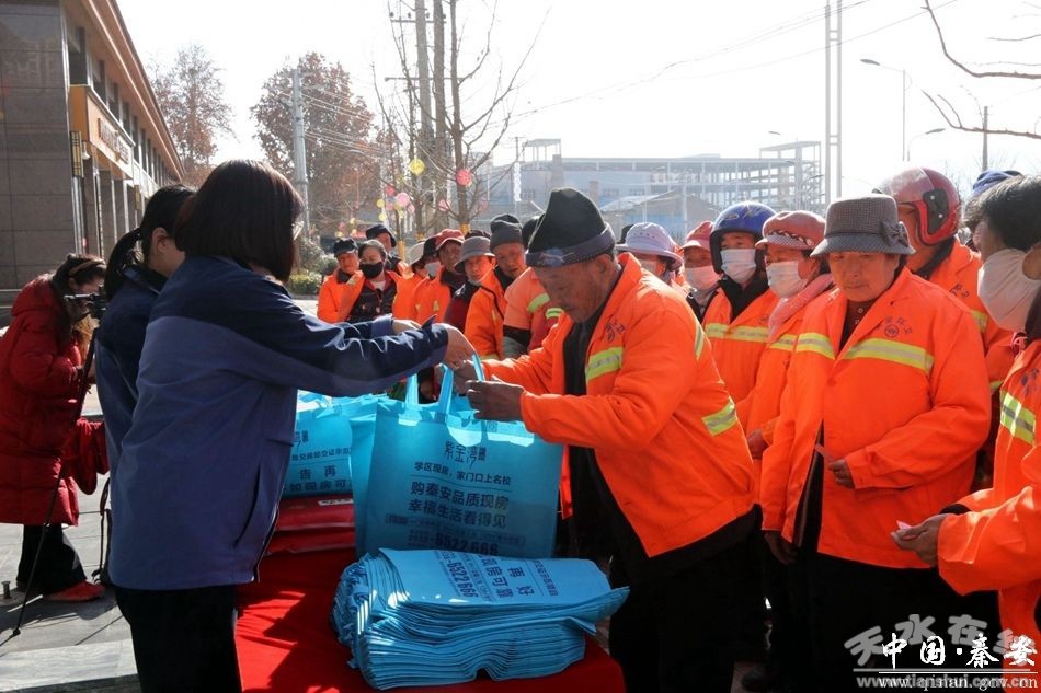 秦安縣紫金灣營銷中心銷售經(jīng)理李亞鵬說:“在新春佳節(jié)來臨之際,能為環(huán)衛(wèi)工人這個(gè)群體,城市的美容師做一個(gè)小小的一個(gè)貢獻(xiàn),是我們義不容辭的義務(wù)。希望通過實(shí)際行動(dòng),讓他們感受到社會(huì)的關(guān)愛與尊重,這也是我們企業(yè)應(yīng)盡的社會(huì)責(zé)任!