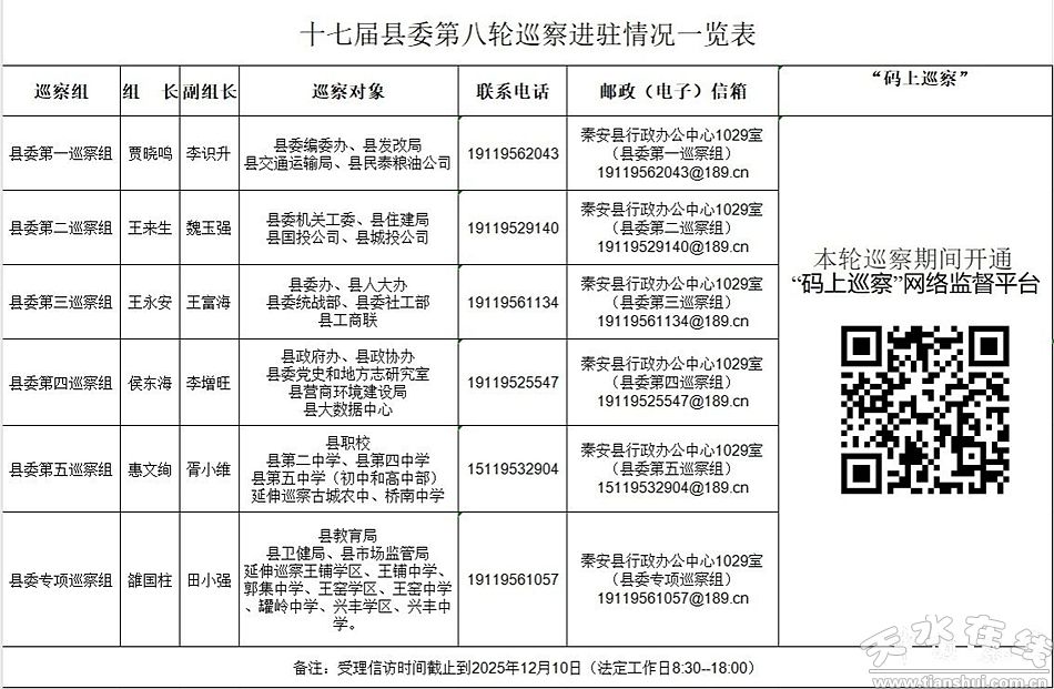 本輪巡察從2025年9月底開始,為期2個半月,縣委巡察組受理信訪截止時間為2025年12月10日。巡察期間,縣委各巡察組分別設立專門信訪電話、郵政信箱和電子郵箱,在被巡察單位設置意見箱、張貼巡察公告,開通“碼上巡察”,主要受理反映被巡察黨組織領導班子及其成員、下一級黨組織領導班子主要負責人和重要崗位黨員干部問題的來信來電來訪,重點接受關于違反政治紀律、組織紀律、廉潔紀律、群眾紀律、工作紀律和生活紀律等方面的舉報和反映。其他不屬于巡察受理范圍的個人訴求、涉法涉訴等信訪問題,將按規(guī)定轉交有關部門處理。