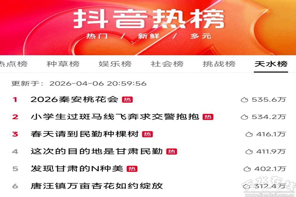 連日來,2026年甘肅秦安桃花會(huì)熱度持續(xù)攀升。4月6日,抖音平臺(tái)天水榜數(shù)據(jù)顯示,“2026秦安桃花會(huì)”話題以535.6萬的熱度高居榜首,成為近期最受關(guān)注的文旅熱點(diǎn)話題。萬畝桃林花開正艷,八方游客紛至沓來,秦安這座“中國桃之鄉(xiāng)”正以滿城春色迎接四海賓朋。