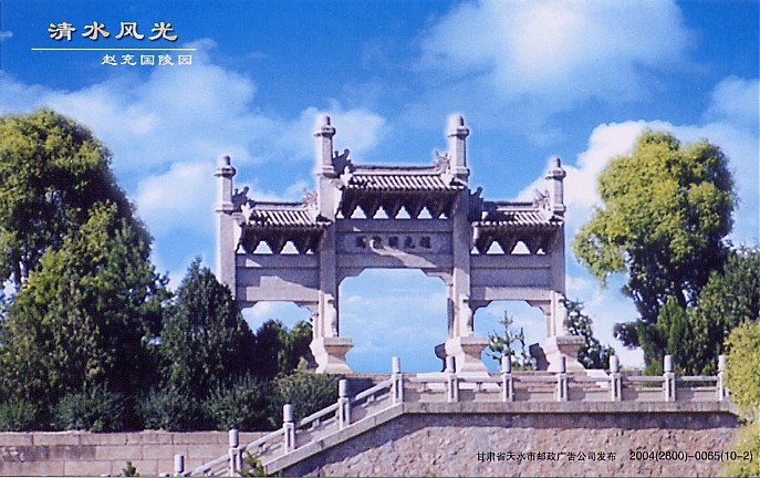 趙充國陵園 位于清水縣城北1公里處的牛頭河畔.始于漢,后歷代辟祭田,修祭殿,勒石刻碑,銘期史跡。1962年公布為甘肅省重點(diǎn)文物保護(hù)單位,F(xiàn)占地面積7000多平方米。陵園建筑典雅肅穆,氣勢恢宏,環(huán)境幽雅,景色宜人。墓區(qū)現(xiàn)存歷代石刻碑廊,宋墓群等省、縣級文物保護(hù)點(diǎn)十多處,是省內(nèi)外賓客觀光旅游和趙氏族系尋根拜祖的圣地之一,也是清水歷史文化的窗口陣地之一。