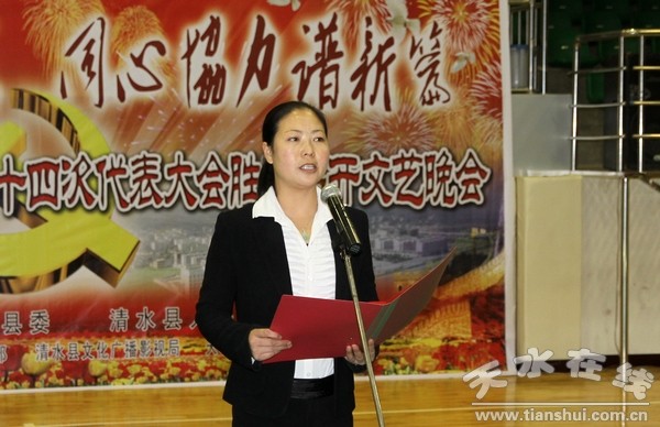 清水縣四大組織領(lǐng)導和全體參會代表一同觀看了文藝節(jié)目,縣委副書記趙云清作了講話,縣委常委、宣傳部長張秀麗主持了開幕式。