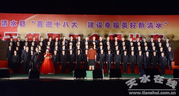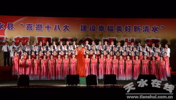 9月27日,清水縣“喜迎十八大,建設(shè)幸福美好新清水”教育系統(tǒng)干部職工合唱比賽在軒轅廣場(chǎng)進(jìn)行,來(lái)自縣六中、縣原泉小學(xué)、縣西關(guān)小學(xué)、縣一幼、縣五中、縣一中、縣三中、縣三幼、縣軒轅小學(xué)、縣東關(guān)小學(xué)、縣二幼和縣育苗幼兒園等城區(qū)12所學(xué)校代表隊(duì)上演了精彩的合唱曲目。清水縣四大組織全體在家領(lǐng)導(dǎo)及部分城鄉(xiāng)群眾共同觀看了合唱比賽。