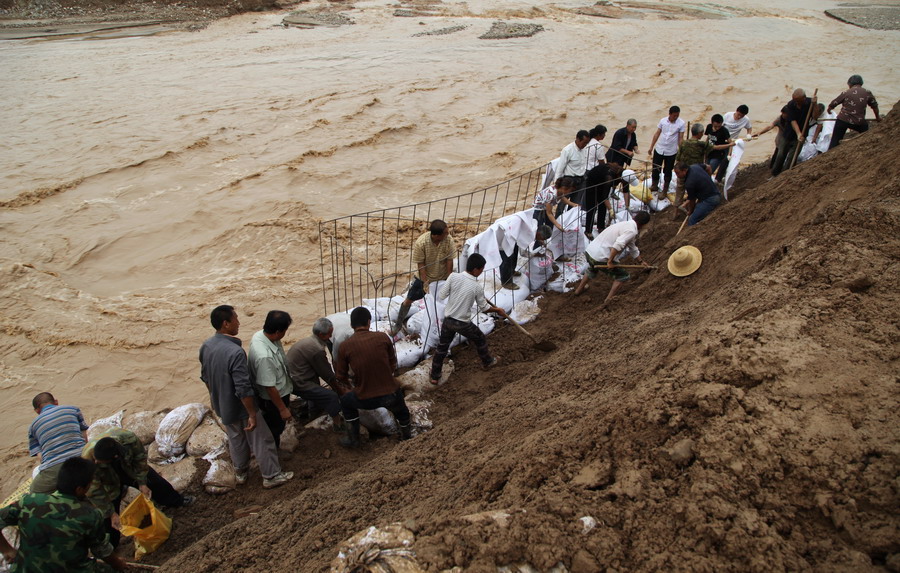 (干部職工正在搶修堤防)