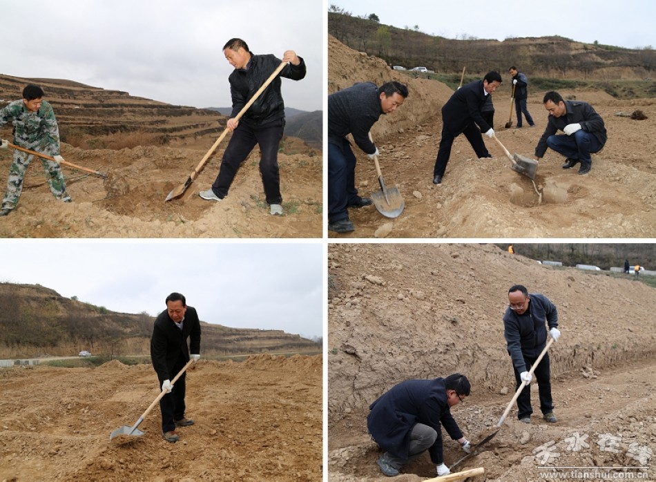 (縣領導趙愛平、楊泉、秦永斌、楊慶森與干部職工一道參加義務幫建核桃園活動)