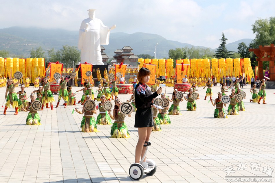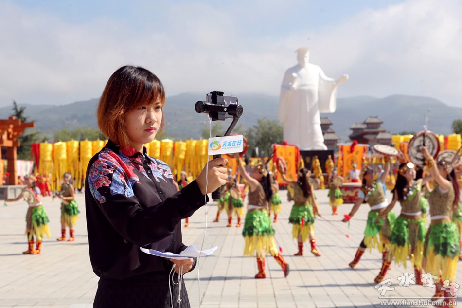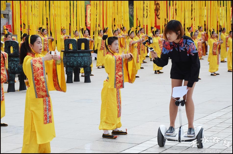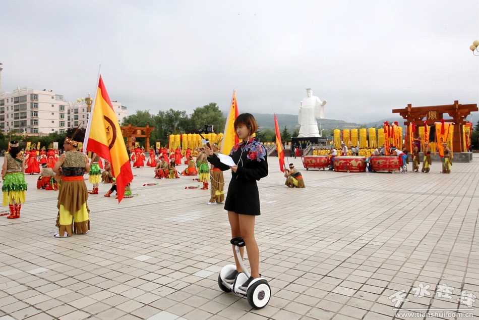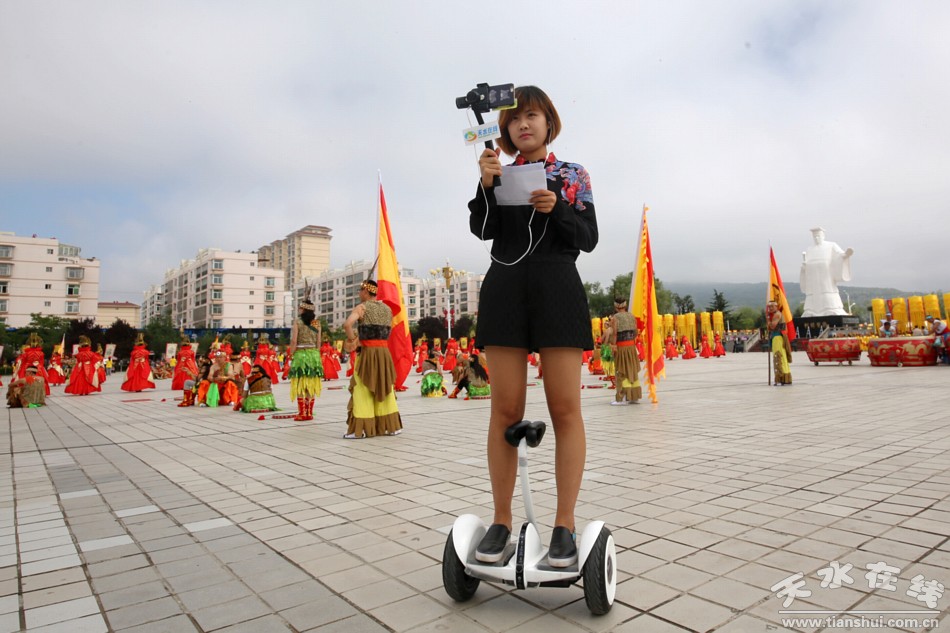 ▲天水在線云記者腳踩平衡車現(xiàn)場直播軒轅黃帝祭祀典禮彩排